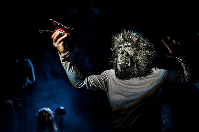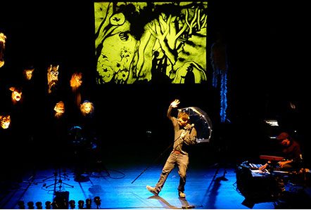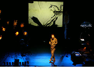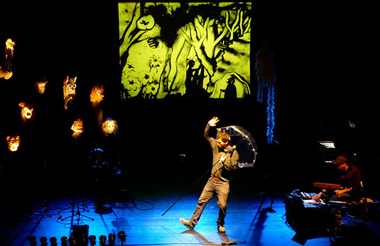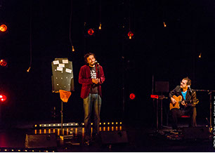 Il y a un hélicoptère, des voix venues d’ailleurs, de l’action, du suspens et de la romance, il y a des sorcières qui rappent et des loups qui font du rock, il y a une forêt enchantée, un océan en furie, une ville aux murs qui parlent, des fourmis balèzes et de geignards géants. Il y a les enfants et nous dans le plaisir immense de la création live. C’est un spectacle qui propose un jeu, un jeu qui se continue hors de la salle, car comme disait Novecento « le plus grand pianiste de l’océan » : Tu n’es jamais vraiment perdu tant qu’il te reste une bonne histoire et quelqu’un à qui la raconter.