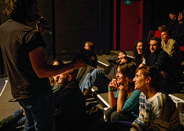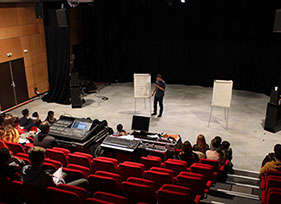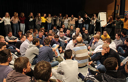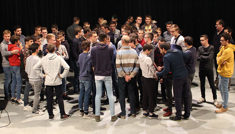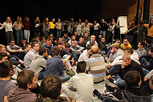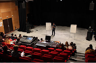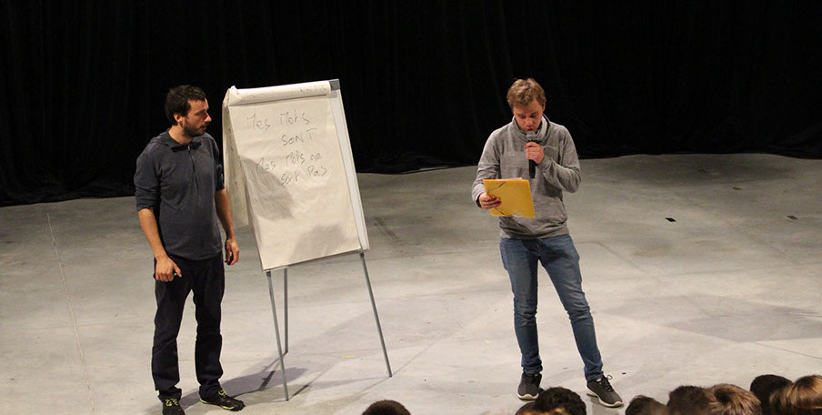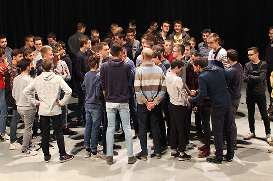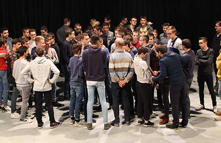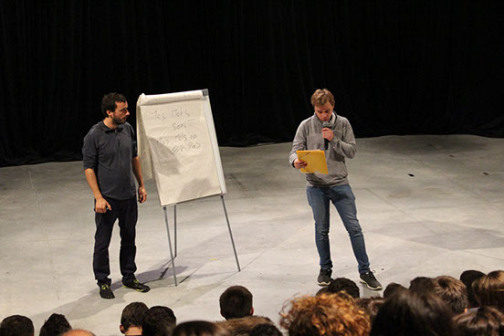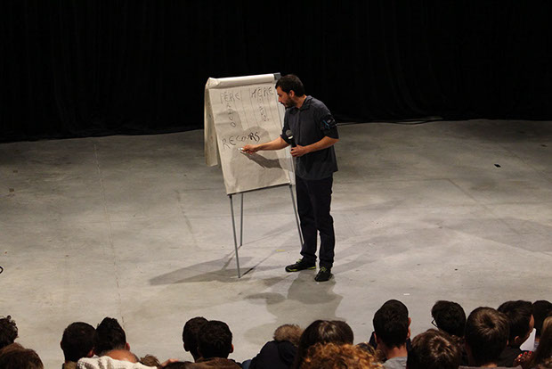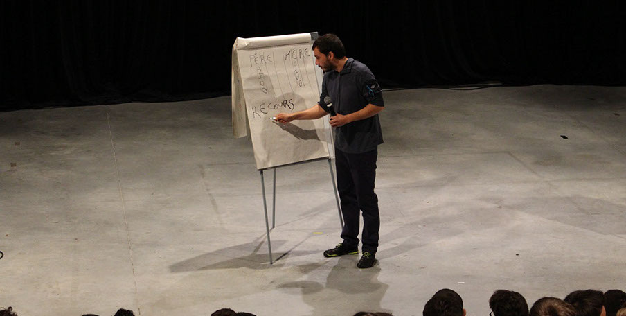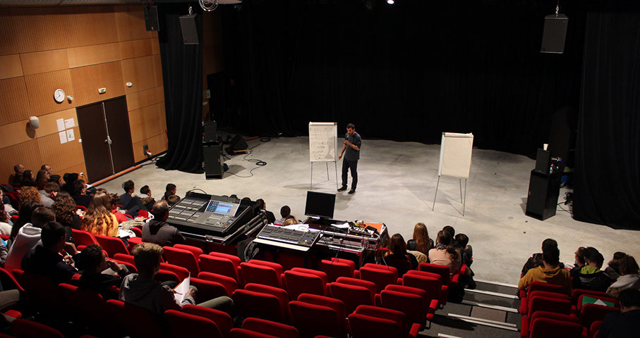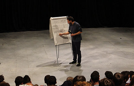 1er temps : une ou deux rencontres en amphithéâtre (master class) d’une durée de 2 heures chacune sur un public de lycéen et/ou d’universitaire, sur un temps scolaire